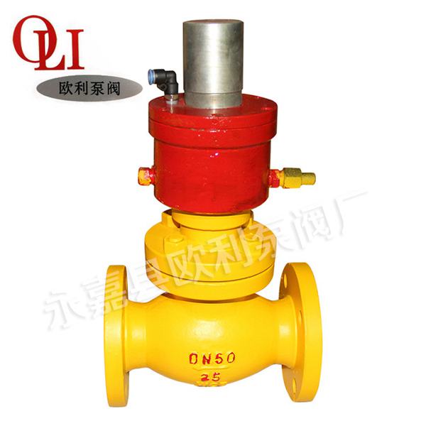 Emergency shut-off valve using gas with ammonia (compressed air, nitrogen) andexplosion-proof solenoid valve to control the valve open close, by the multi springpneumatic diaphragm actuator or floating piston actuating mechanism and a regulating valve, adjust the instrument to receive the signal, the flow control process in the pipeline, switch on or switch off. The control room touch switch of the electromagnetic valve or manual that gas pressure relief in case of emergency, or high temperature is greater than or equal to 80C when the fusible alloy melts, while the cylinder automatic pressure relief, cut off valve is less than or equal to 3 seconds quickly shut down andstop leakage, play a role in safety protection.